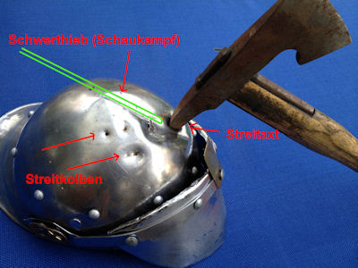 ein Bogenschützenhelm, der mit den verschiedensten Waffen bei unser Mitwirkung